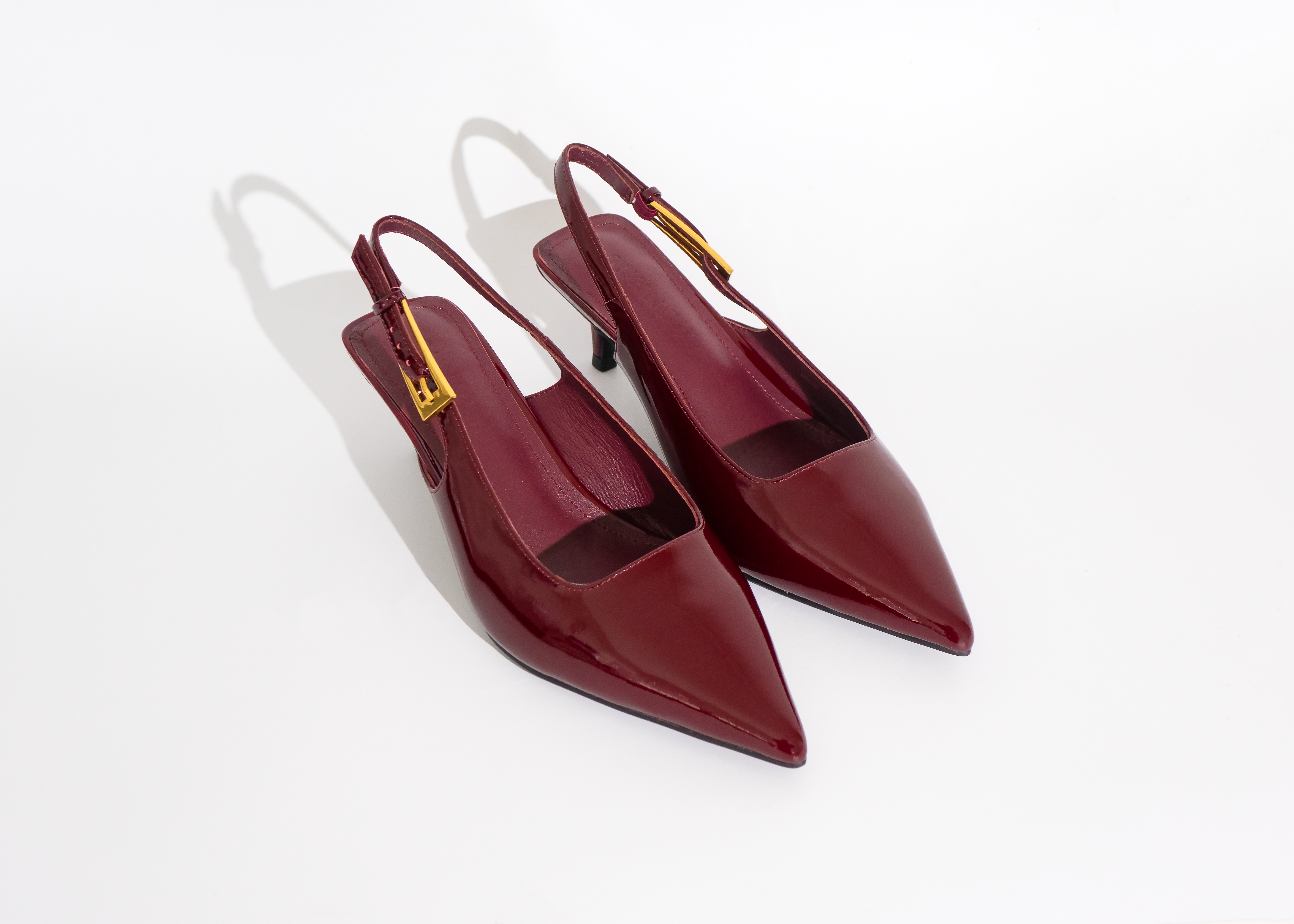 This luxe slingback in cherry patent leather is the epitome of effortless styling whilst still looking like you thought of everything.